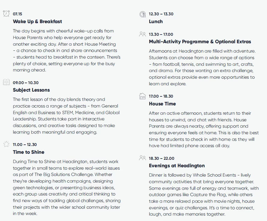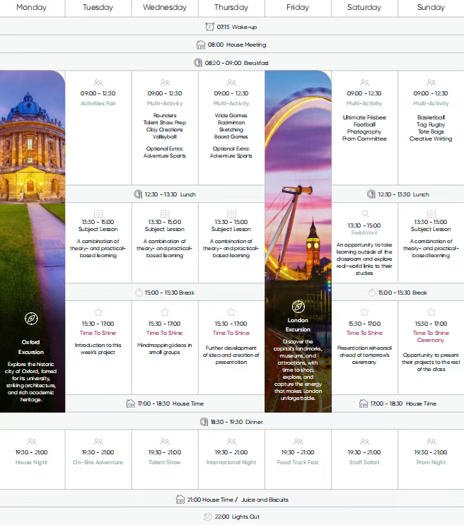 本次夏令营在 Headington Oxford 校区开设。校园安全成熟,项目式学习(project-based)将“问题”与现实情境结合;体育、艺术、城市探索与全校性活动贯穿每日,强调自信表达、团队协作与独立性——是进入英国中学体系前“先体验、再决定”的理想之选。