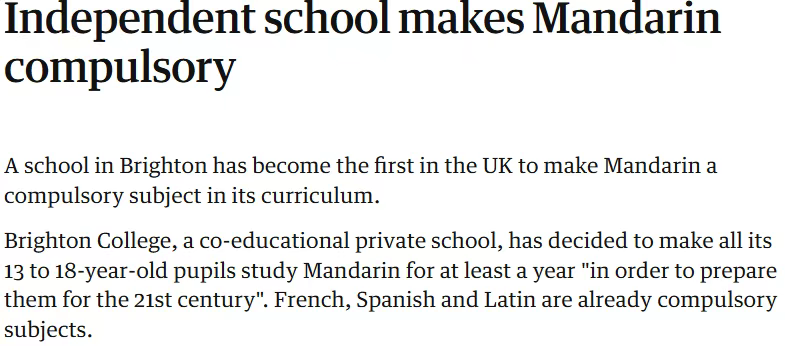 走在潮流前端的布莱顿中学从2006年就开始大规模引入中文课程,并在多个年级把中文纳入核心学习内容。当时的校长Richard Cairns(理查德·凯恩斯)就指出:“我的一个主要目标是让我们的学生适应21世纪的现实,而21世纪的现实之一就是中国成为世界上经济增长最快的国家之一。”