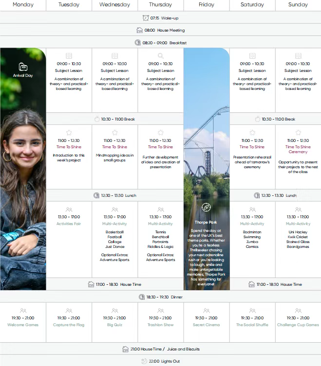 年龄:12–16 岁(英语综合营 English Adventurers 接收 11–16 岁)