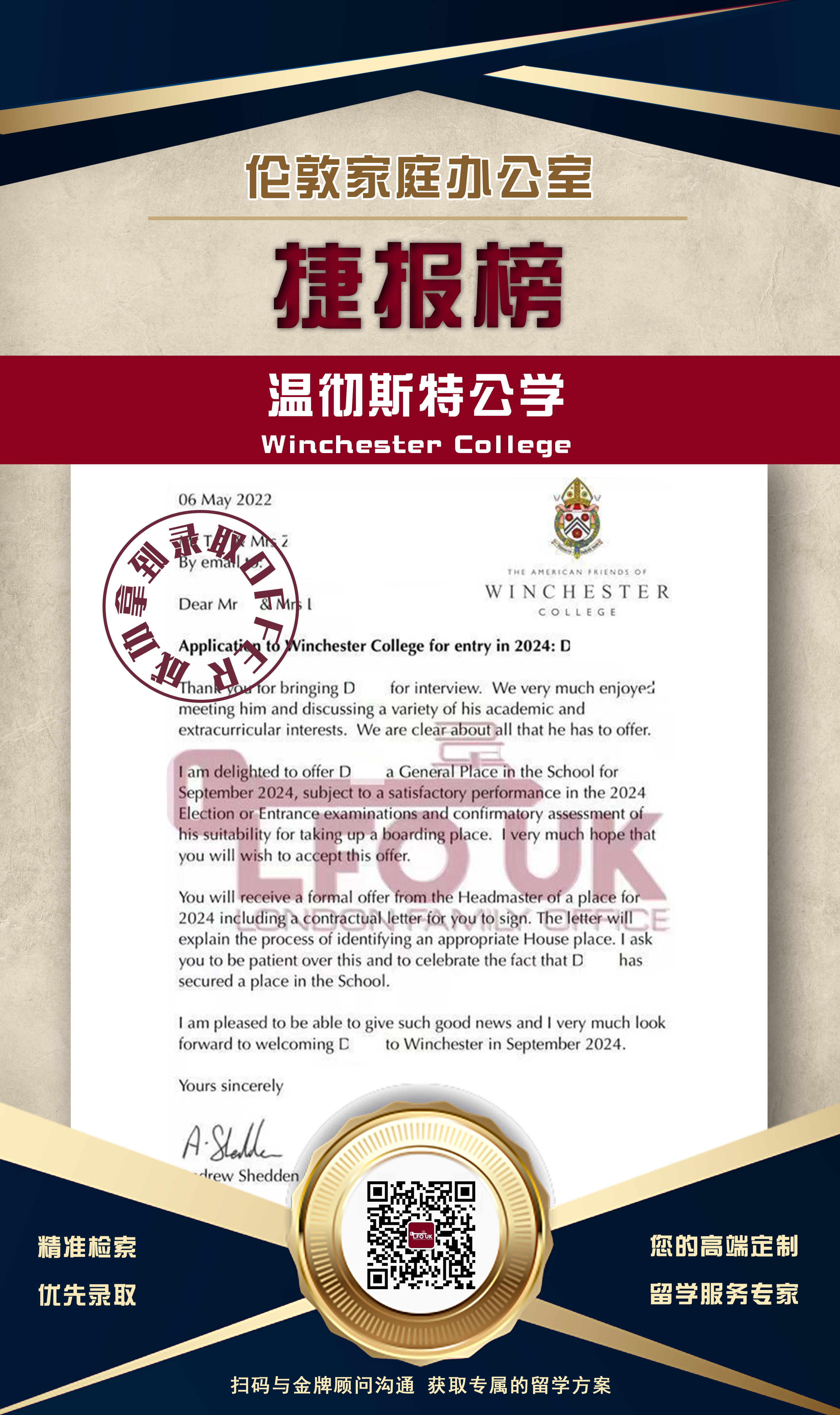 D同学曾就读于上海惠灵顿六年级,有非常良 好的学习和阅读习惯。对于老师的授课方式有 着自己的要求。 在遇到LFO明确了以后的目 标学校之后, LFO为D同学量身定制了学习计 划, 以自主学习为主, 授课老师总结提点, 班主任监督作业完成质量、错题总结和考试技 巧以及对题目的延展。 在经过老师团队和学生 的共同努力下, D同学一路过关斩将,最后在 第一轮拿到Winchester 的录取通知, 也是D 同学的第一志愿。