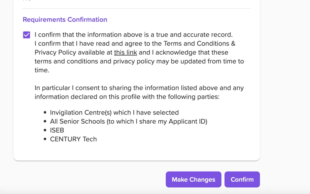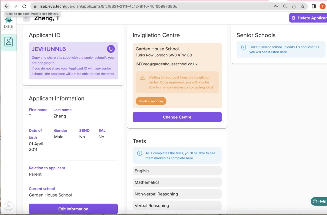 完成并确认学生的注册信息后,将会出现上图(左边是申请人ID,中间是考点的“确认中”,右边是所申请的学校在等待更新学生的申请ID)。接下来需要家长做的还有两个步骤: