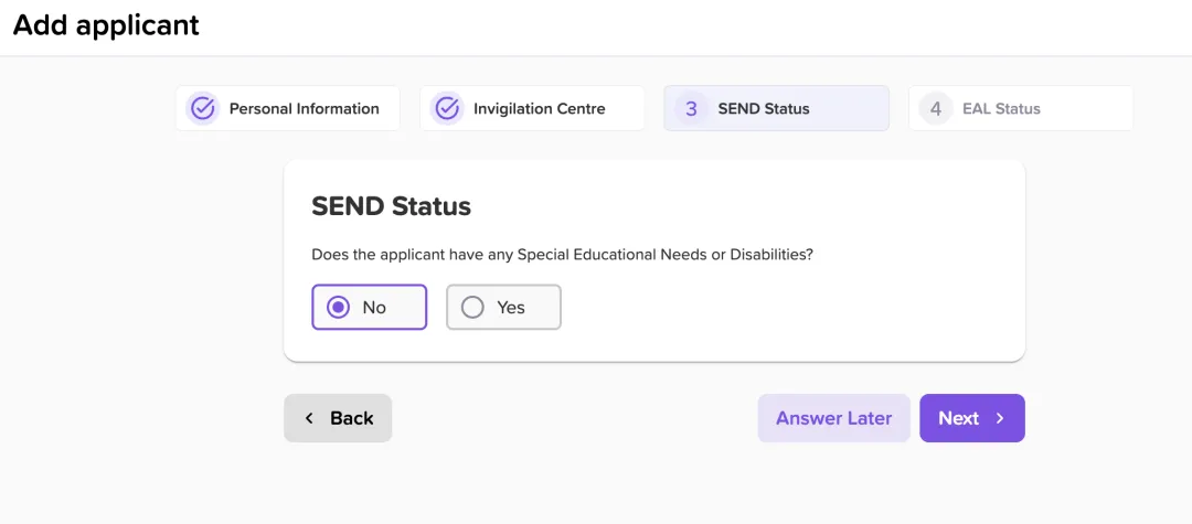 SEND/EAL:主要针对有某些障碍或者残疾的学生,可以申请延长25%的考试时间;如没有,则填"no"即可。